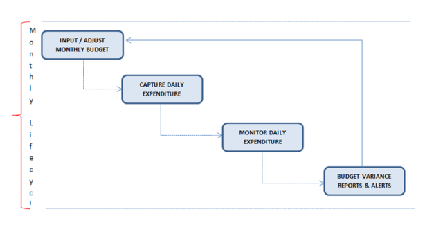 We will also not add other features that can make the app usable in real world, such as choosing date ranges for the expenditure vs budget when running the report. A simple Process diagram is shown below: